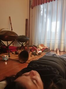 Es un trabajo previo y posterior a una sesión de baño de Sonido, que en este caso es una parte del trabajo total. Mediante un método y plantillas para autoevaluación guío a la, o las personas, hacia estados ampliados de consciencia con sonidos para profundizar en la propia psique y obtener información de sí misma según el propósito planteado,